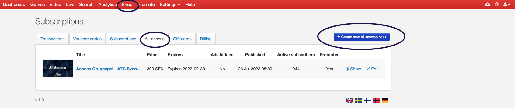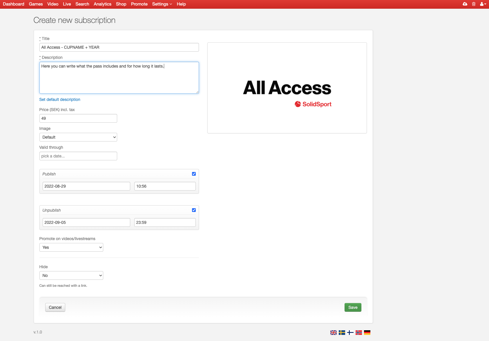 When you are live streaming an event or a cup you might want to have an All Access pass. The All Access pass is a one time payment/subscription that allows your viewers to see all games or the whole event for a reduced price, instead of them buying all live streams. The All Access pass also gives your viewers the opportunity to watch all replays. This pass is time limited and you decide for how long it is valid through.