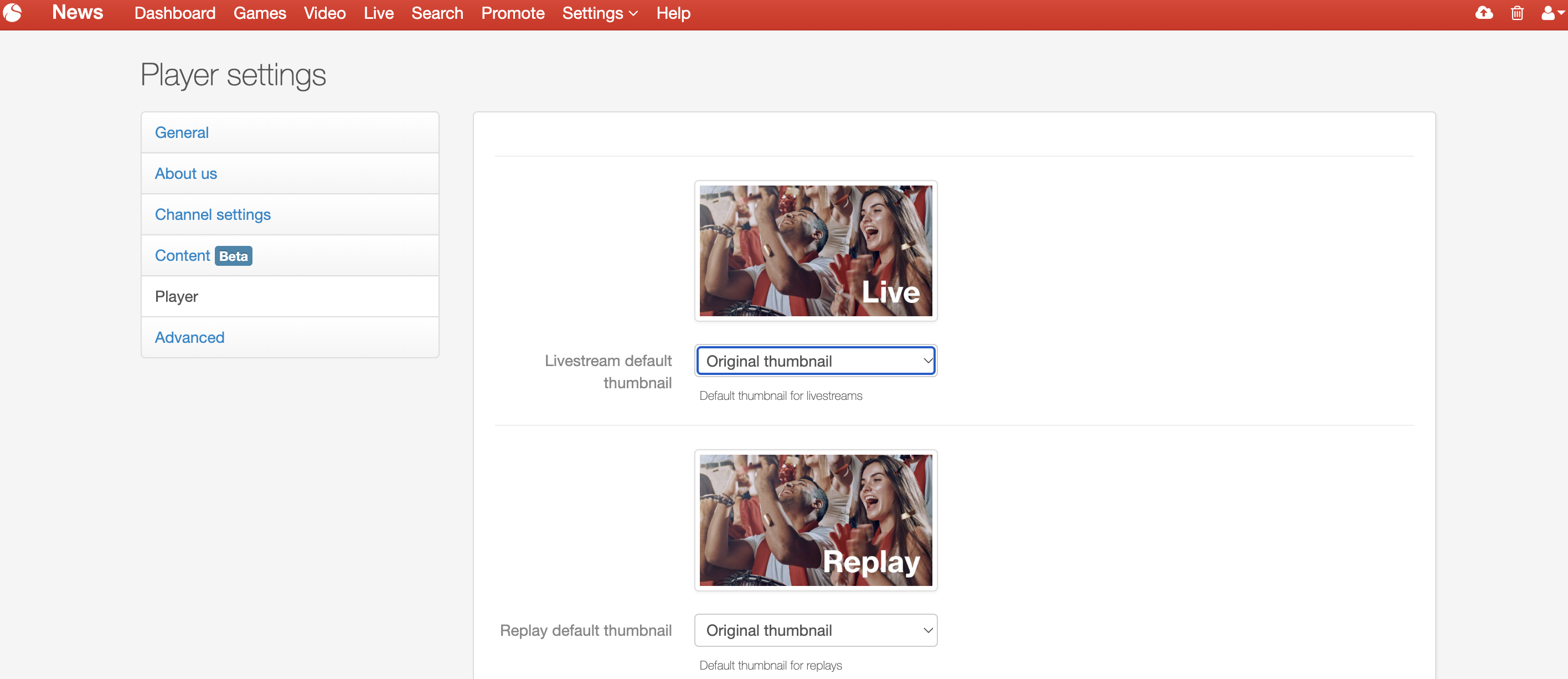 Go to the admin dashboard (settings-advanced settings) of your channel and then Settings > Image Archive > Add your images here,  then go to Settings > Channel > Player here you can choose what picture from the image archive you want to use as a thumbnail.