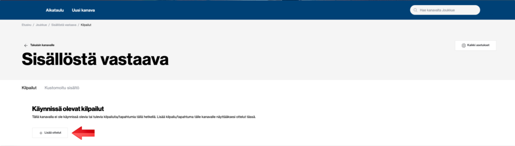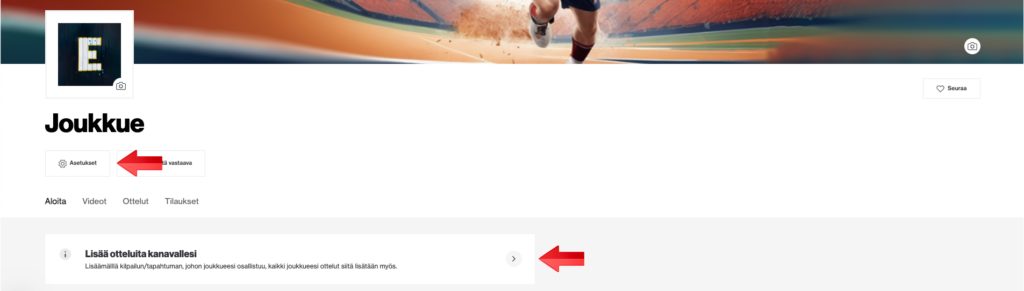 1. Kirjaudu sisään kanavallesi ja varmista, että olet kanavan admin, (Joukkueen nimen alla näkyy “Asetukset” painike.). Klikkaa alempaa kohdasta “Lisää otteluita kanavallesi.”