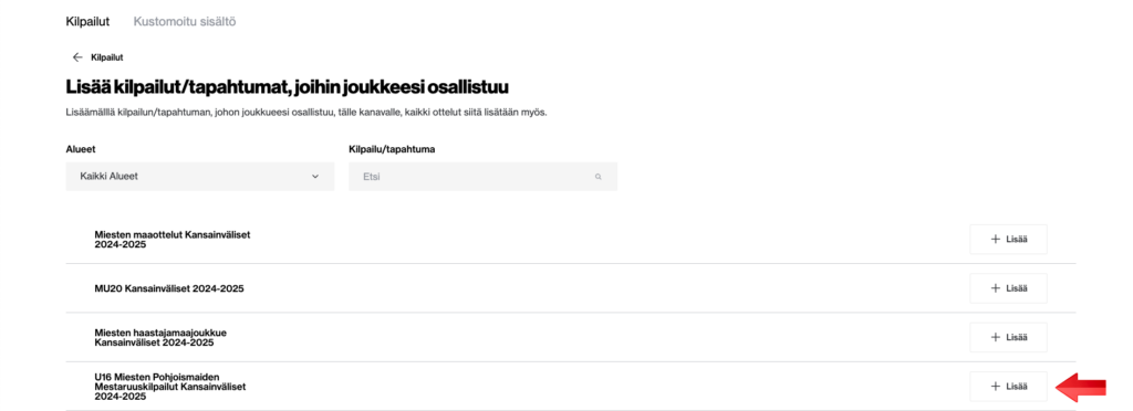 2. Painikkeesta “Lisää ottelut” näet valittavissa olevat sarjat.