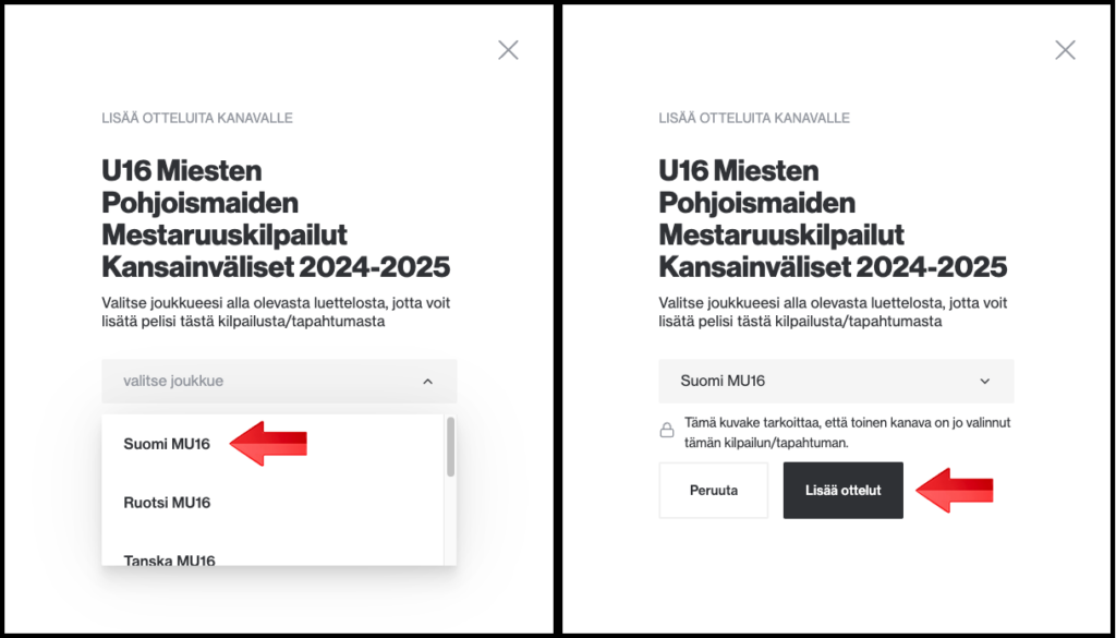 4.Valitse sen jälkeen oma joukkueesi ja viimeistele valinta painamalla “Lisää ottelut”. Tämän jälkeen voit palata kanavan etusivulle painamalla “Takaisin kanavalle” sivun vasemmasta yläkulmasta.