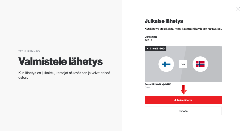 Huomioithan, että ottelun päivittyminen kanavalle ja lähetysvalmiiksi voi kestää hetken “Valmistele suora lähetys” painikkeen aktivoimisesta. Kun livelähetys on valmis, painike muuttuu “Muokkaa” muotoon. Tämä tarkoittaa, että ottelu on valmis lähetettäväksi.