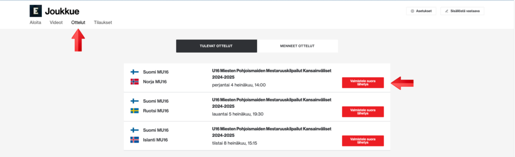 5. Klikkaa “Ottelut” välilehteä ja näet kaikki kanavalle yhdistetyt ottelut. Valmistele ottelun livelähetys napsauttamalla punaista “Valmistele suora lähetys” -painiketta.